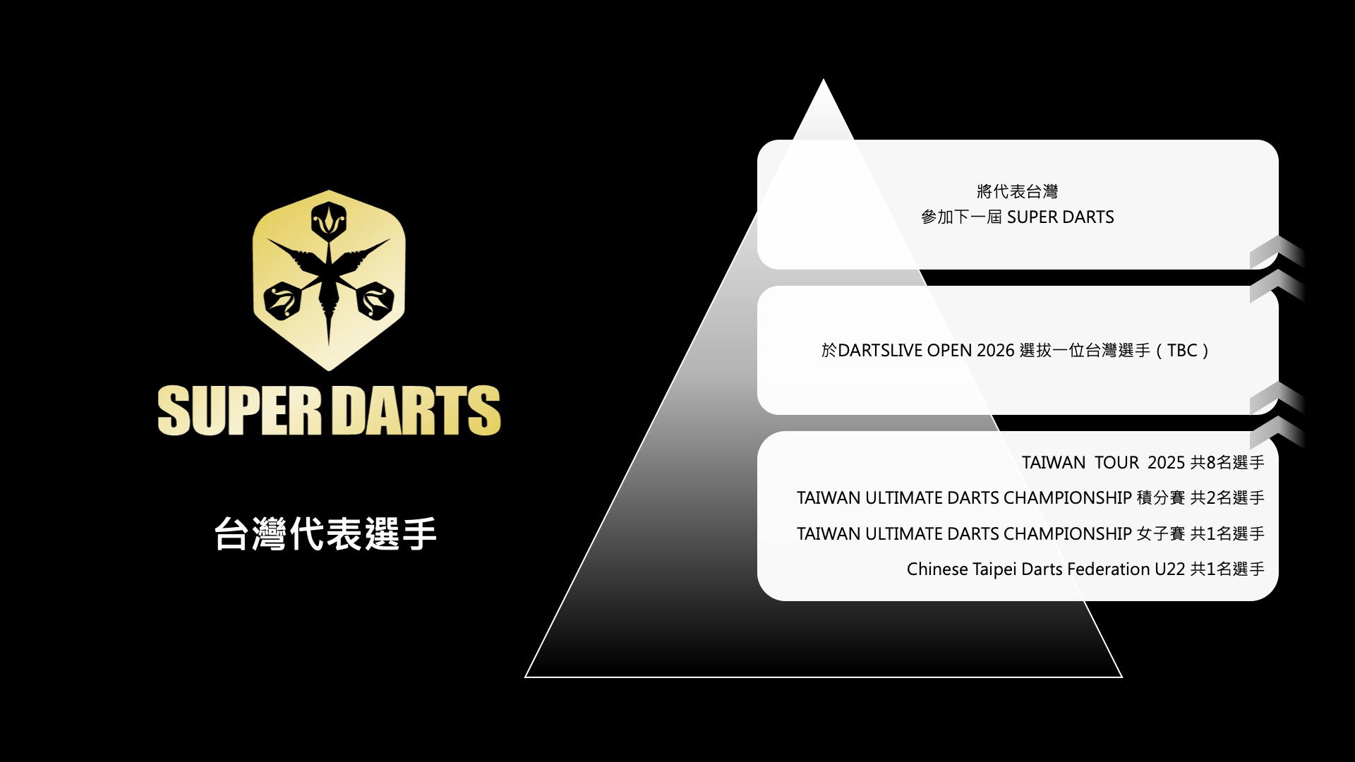 TAIWAN TOUR 是台灣最高等級的軟式飛鏢巡迴賽事,代表國內競技水準的巔峰對決。每年吸引全台各地菁英選手參與,透過專業分級與嚴謹規則,打造與國際接軌的賽事平台。無論你是頂尖好手或渴望突破的新星,TAIWAN TOUR 都是挑戰自我、邁向國際舞台的起點!